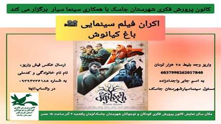 فیلم سینمایی باغ کیانوش در کانون پرورش فکری شهرستان جاسک اکران شد.