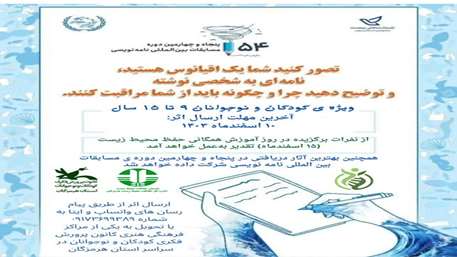 وی افزود: علاقمندان به موضوعات محیط زیستی ۹ تا ۱۵ سال که خود را اقیانوسی تصور کرده و نامه ای به شخصی نوشته و گفته اند چرا و چگونه باید از او نگهداری شود.