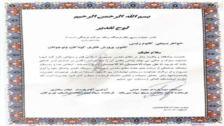در مراسم پایانی هفته دفاع مقدس که در محل پارک ساحلی شهر بندر سیریک برگزار شد از مسئول مرکزسیریک به سبب همکاری در برپایی غرفه کودک و نوجوان و اجرای فعالیت های متناسب با این ایام با حضور مسئولین توسط فرمانده سپاه استان و شهرستان تقدیر شد.